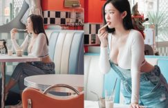 美式餐廳什麼時候出了兩杯重乳?作在窗邊的這位就是,穿著白色的短版長袖上衣,搭上吊帶牛仔褲,看似休閒輕便卻罪惡到不行,不只露出纖細無比的水蛇腰間,連領口也直接開到最下面,隨之乍現的是一雙渾圓又飽滿的巨乳,不論是遠視還是近看都壯觀無比! (